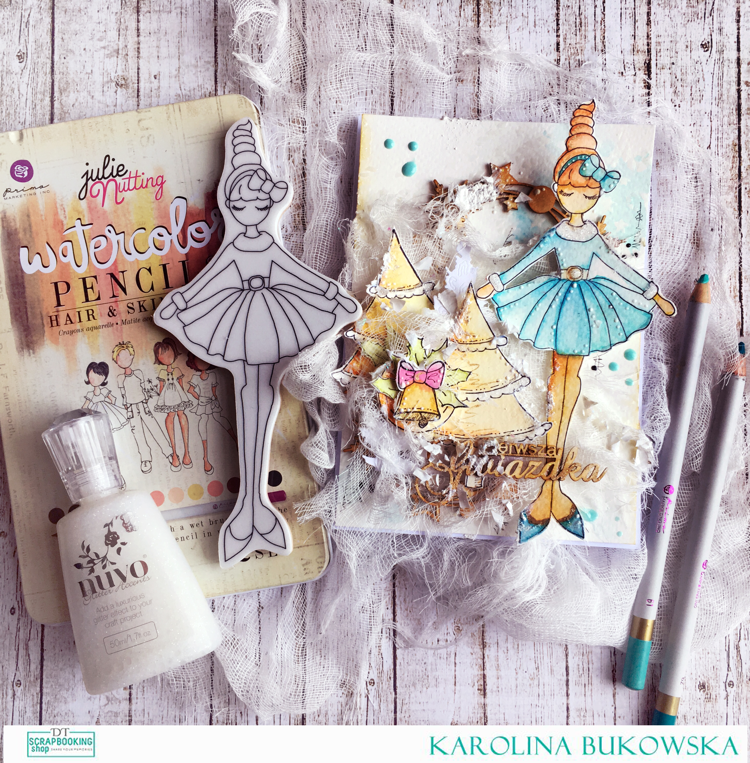 Dziś wpadłam do Was z akwarelową kartką. Marzy mi się zima pełna śniegu i bieli…. choć mamy dopiero jesień… już obmyślam zimowe dekoracje i kartki dla najbliższych. To jedna z nich. Prosta i przestrzenna kartka dla mojej małej chrześnicy. Postawiłam na stemple i kolorowanie ich kredkami akwarelowymi od Primy. Uwielbiam set z odcieniami brązów oraz te dwie niezwykłe kredki w kolorach turkusów!!! Tło stworzyłam używając pastelowych farb akwarelowych od Primy… mają delikatnie matowe wykończenie, które przełamałam brokatowym śniegiem i brokatem w płynie od Nuvo. Kompozycje wzbogaciłam o położenie maski i kropelek w płynie. tekturki od Agaterii podkreśliły temat kartki a delikatne tuszowanie nadało ram projektowi. Mam nadzieje, że karteczka przypadnie Wam do gustu!