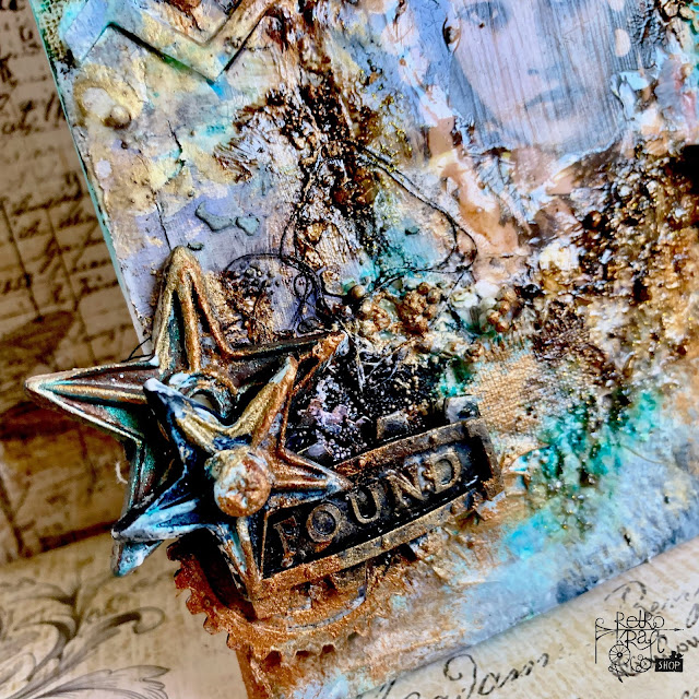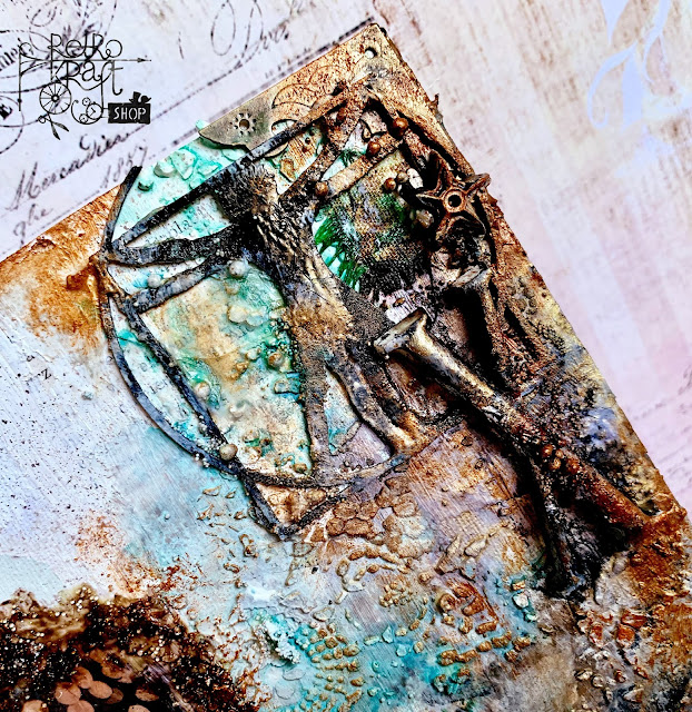 Odlewy pomalowałam gessem i dodałam farb oraz fluid imitujących rdzę.