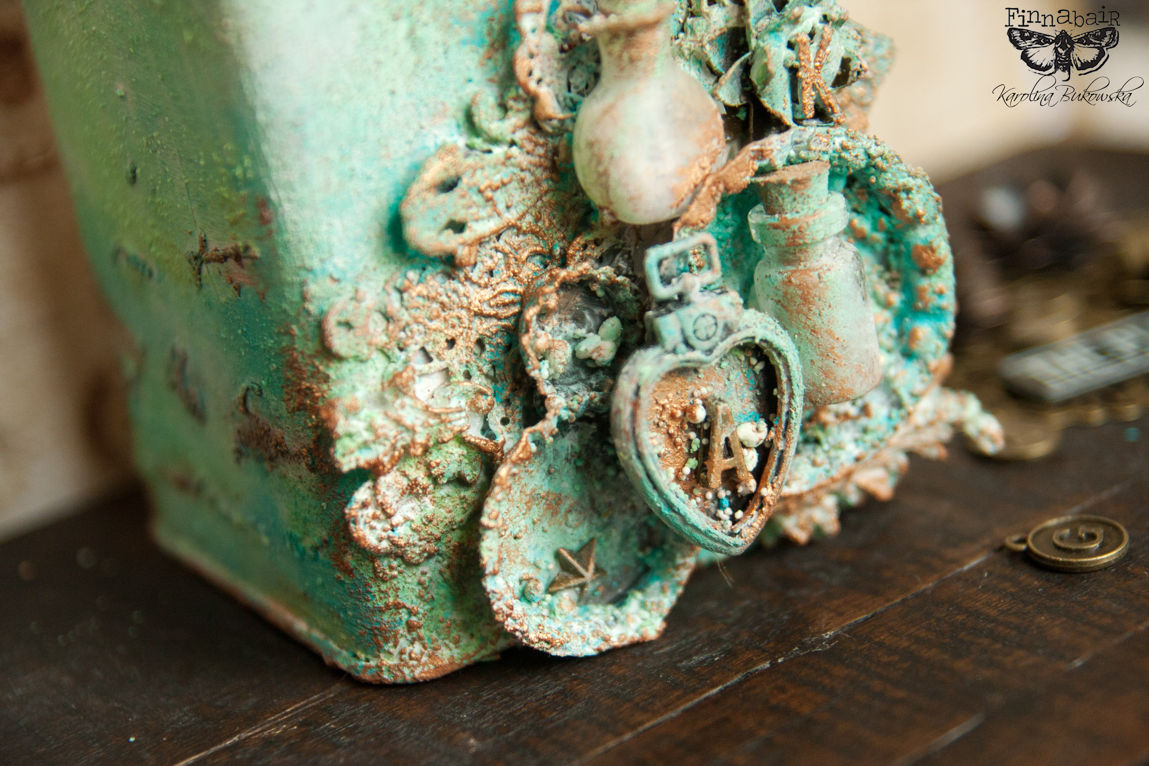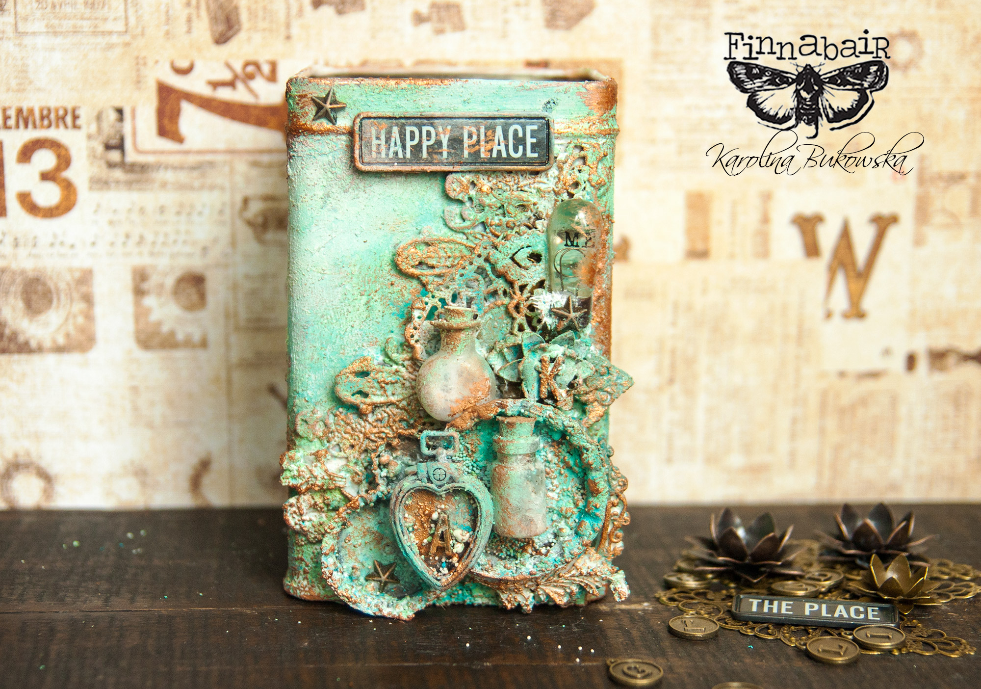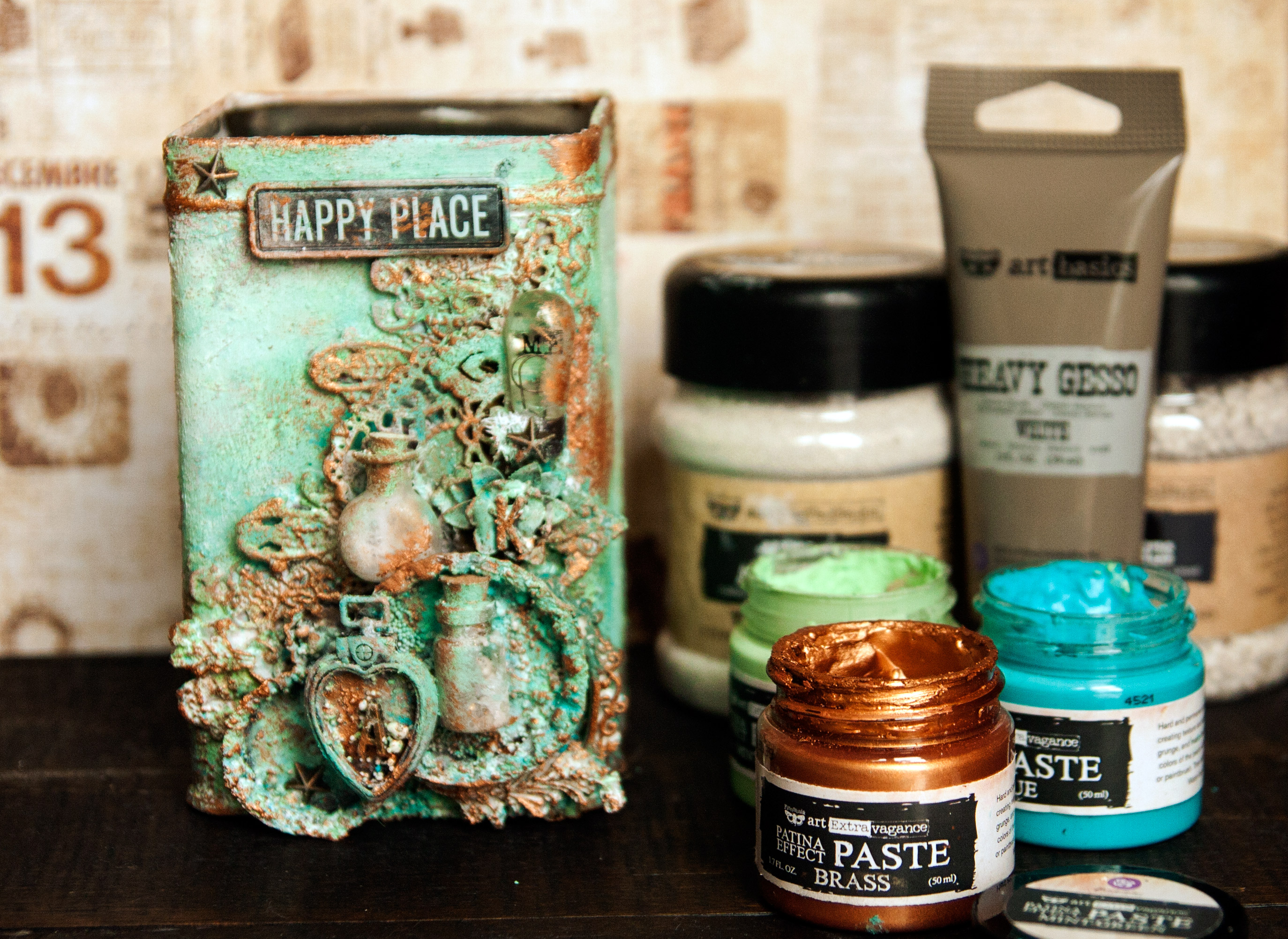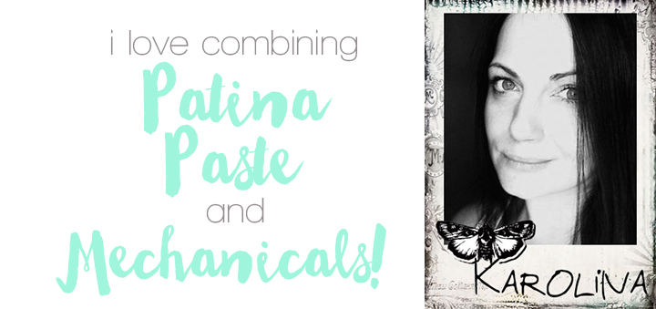 I was very excited to take part in this month’s Art Recipe because I really love the products combo: Patina Effects Pastes and Mechanicals metal embellishments. For this project, I felt inspired to transform an old coffee tin. I like surrounding myself with beautiful objects and so I took this plain looking boring tin and decided to give it a new life. I love the result so much that I’m thinking of creating a whole collection of altered tins.