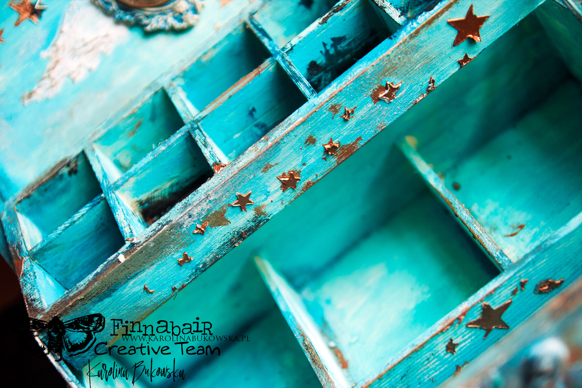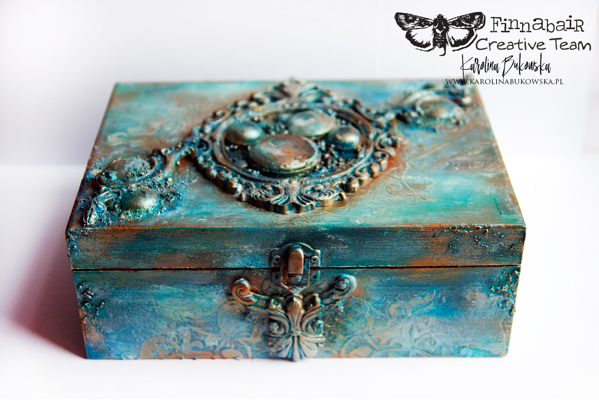 2. I let it dry and I painted my box with Blue Patina Paste mixed with water. Thanks to this combination, it was easier to paint hard to reach places.