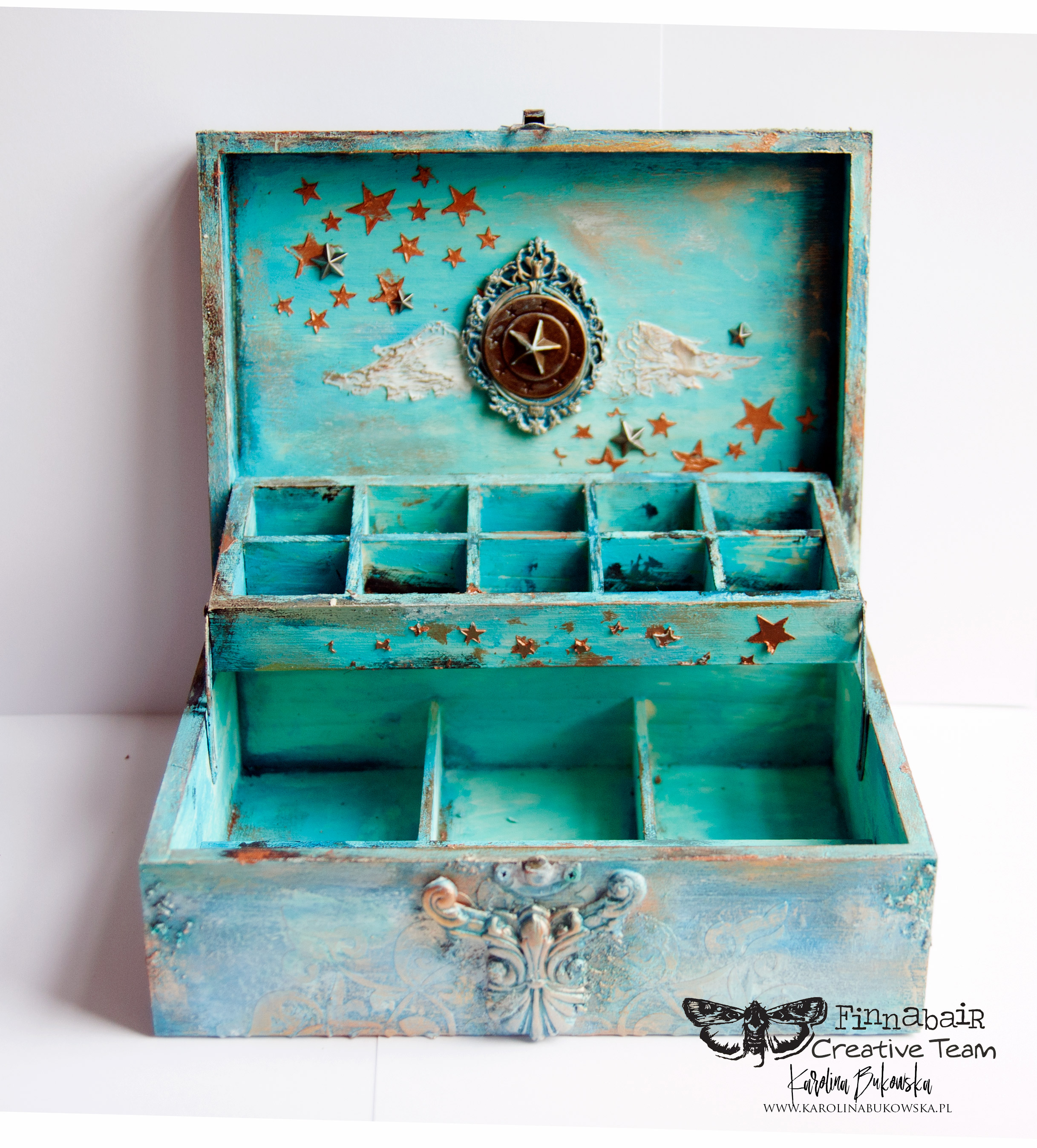 This month’s recipe featuring „Spirits” inspired projects + brilliant Finnabair products was a very tempting artistic task that made me rub my hands in delight. Why a box? In my family, many fairy tales, legends, and magical stories were passed on from generation to generation. I wanted to create a special box to hold gems, oils and my grandmother’s cards that deserve their very special place. I wanted to connect useful and mythical in one, I hope I succeeded.