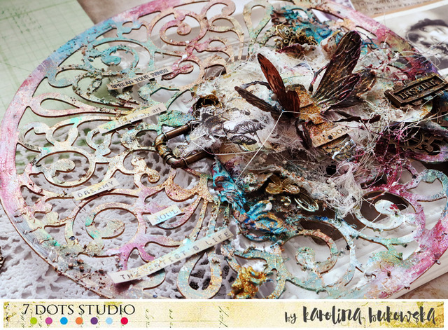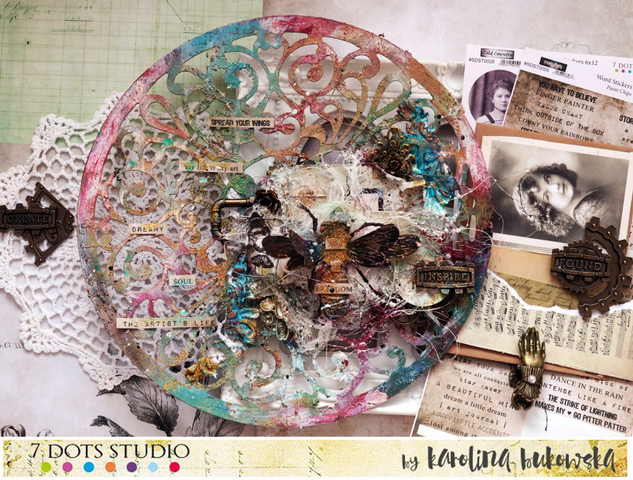 Today, I created a design on cardboard. I’m back with a page from Air Mail and Garden Party collection. I put a soldered bee on the Air Mail paper. I added decorations and wonderful stickers from 7 Dots Studio. With stickers and die-cut elements you can create lovely layers and add details to your work.