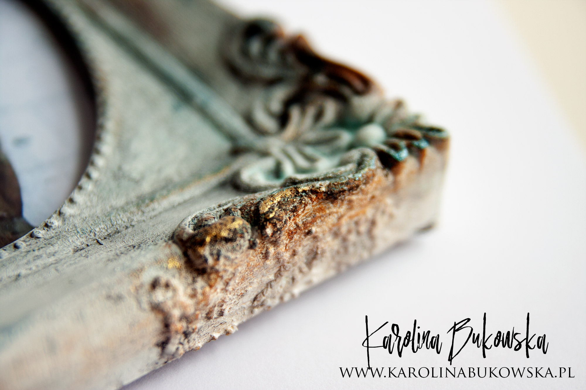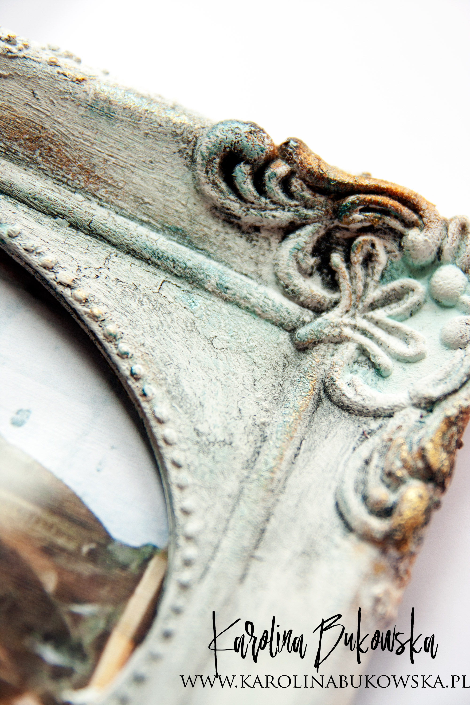 W postarzaniu ramki bardzo pomocne okazało się MEDIUM DO SPĘKAŃ, spójrzcie na te delikatne pęknięcia. Są przepiękne! Przed nałożeniem farby i MIXED MEDIA TUSZ SPRAY CADENCE LIGHT BLUE były bardziej widoczne. Jednak efekt, który uzyskałam bardzo mi się podoba!