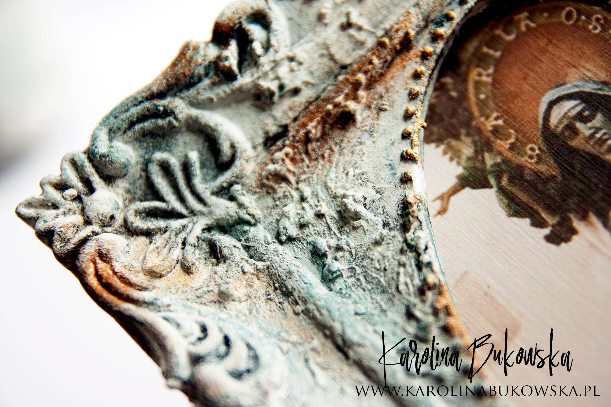 Do jej stworzenia użyłam GESSA, które stanowi podkład w mojej pracy, dodałam odrobinę PASTA TEXTURE CADENCE, dzięki czemu uzyskałam chropowatą powierzchnię. W miejsca, gdzie znajduje się ornament naniosłam FARB AKRYLOWYCH CADENCE BLACK, po wysuszeniu całość pomalowałam FARBĘ AKRYLOWĄ CADENCE WHITE. Uzyskałam przepiękne prześwity czarnej farby, które podkreśliłam FARBĄ DO ŚWIEC CADENCE GOLD i FARBĄ METALICZNĄ CADENCE DORA SORBET. Ponownie całość przetarłam białą farbką.