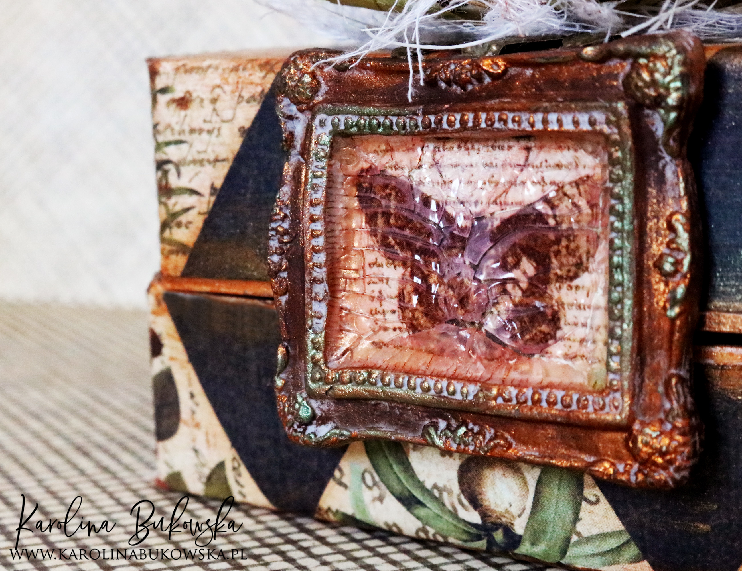 I distressed my project with wax and metallic paint. I enjoyed making this project very much. During making it I thought everything made with this collection would look great and a little bit vintage.