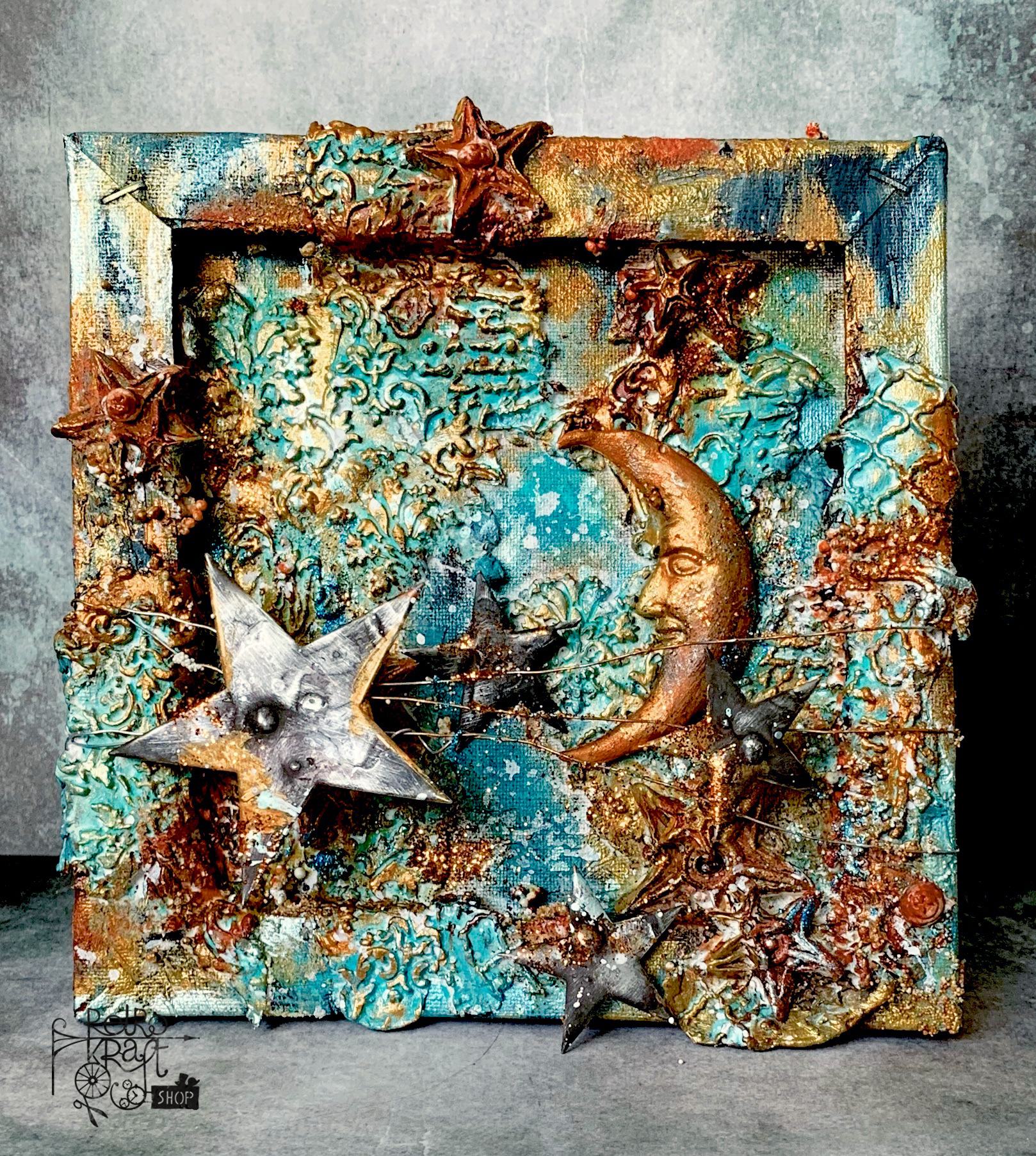 Całość postanowiłam podkreślić efektem rdzy od DecoArt. Niezwykle teksturowa kompozycja, która powstała na blejtramie.