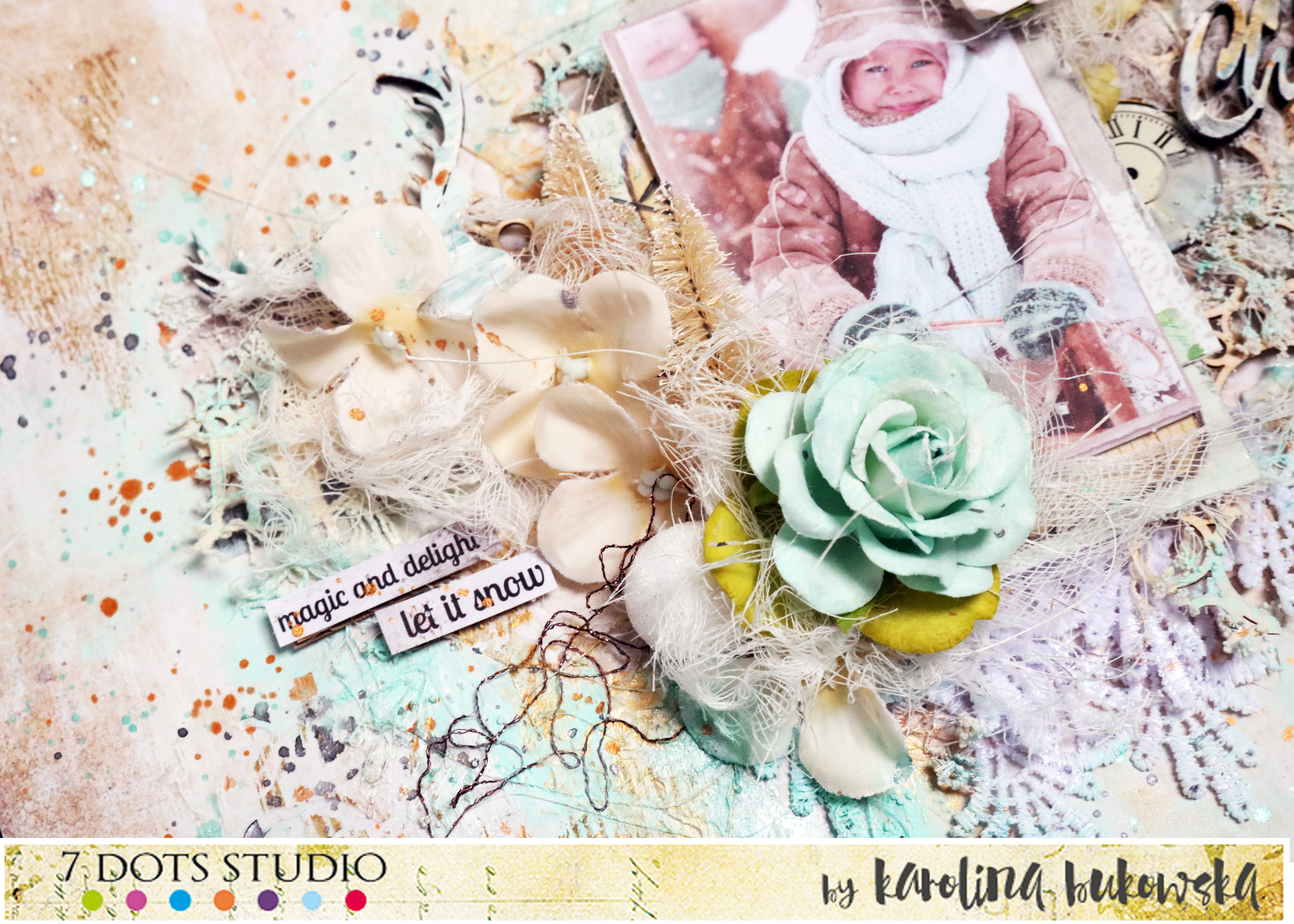 Hi. Today, I’m sharing with you my layout. To create this piece I choose the Northern Lights – Starlight paper to work with. I add stickers and paints. I love this colours and photo.
