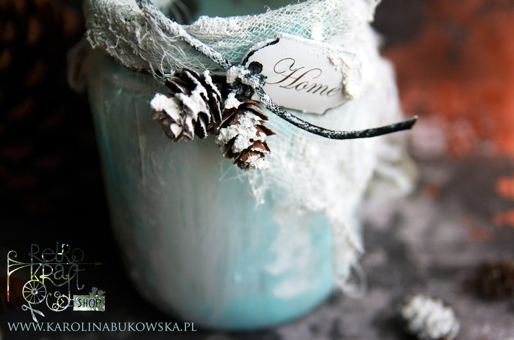 Przygotowałam dla Was lampion, którego bazą jest oczywiście słoik, na który nałożyłam Media Fluid Acrylics – Titanium White – DecoArt. po wyschnięciu rozpoczęłam cieniowanie, tu przyszły mi z pomocą kredki – Distress Crayons Set 1 i 3- Ranger. No koniec lampion delikatnie ozdobiłam: gazą przyklejoną na żel medium, gessem białym oraz platkietkę i szyszki.