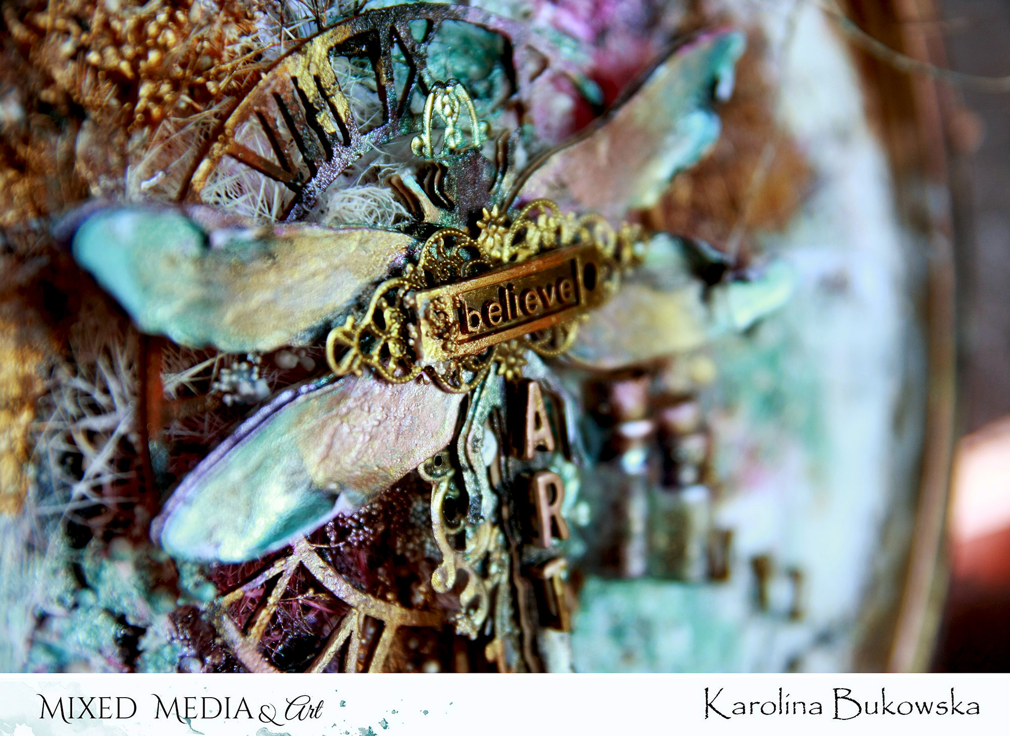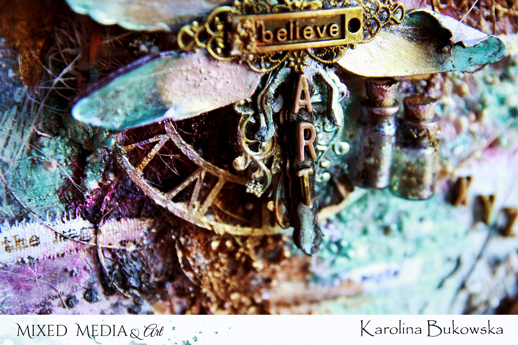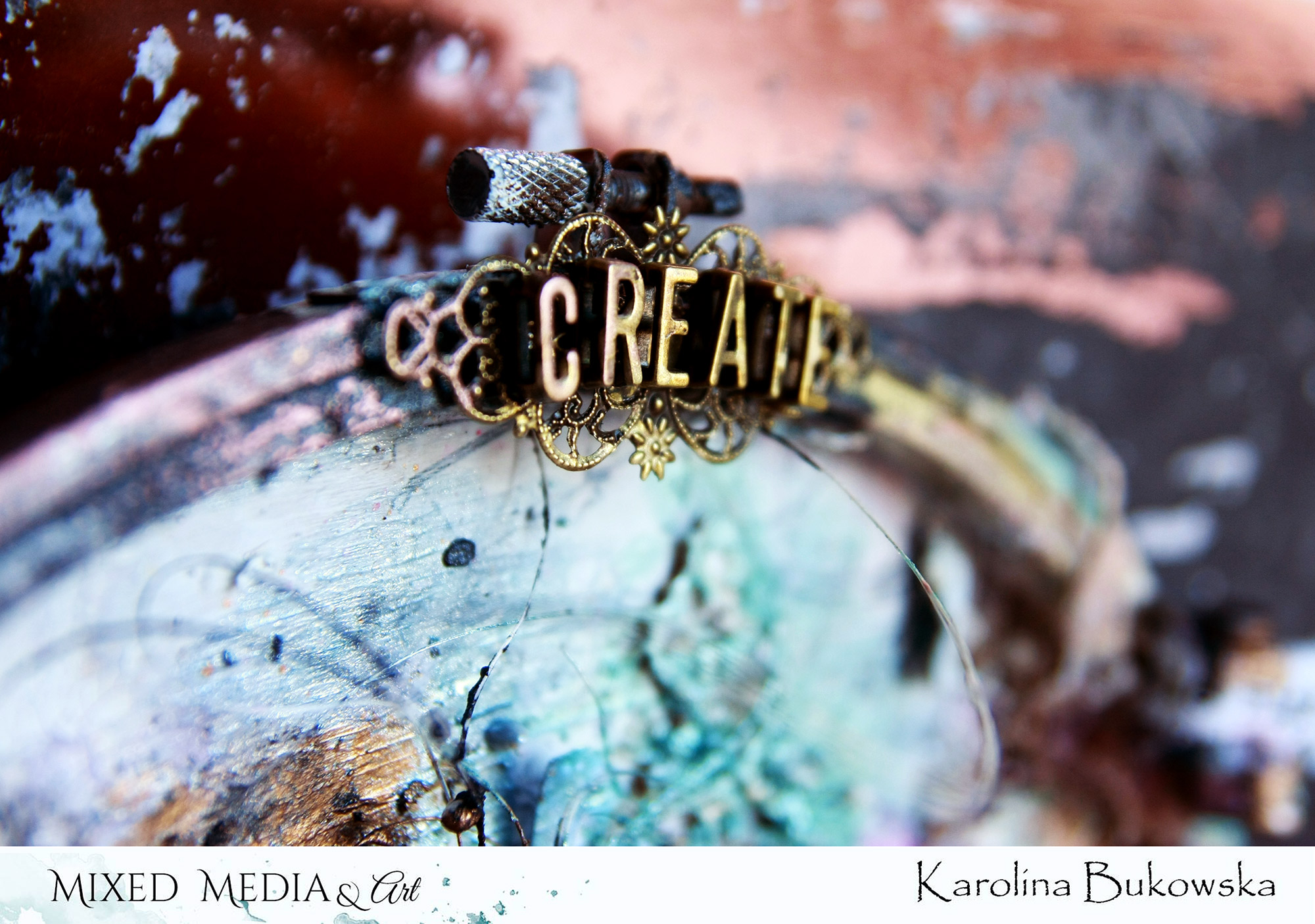 Oczywiście rozpoczęłam od położenia Heavy Gesso – White oraz posty modelującej i teksturowej przez maskę. W moim projekcie użyłam masek od Agaterii oraz SnipArt. Tym razem postawiłam na prosty wzór. Jestem miłośniczką tekstury i warstw. Użyłam wielu mixed media produktów do stworzenia tła i detali , ale moim faworytem jest Art Alchemy – Sparks and Art Alchemy- Waxes.