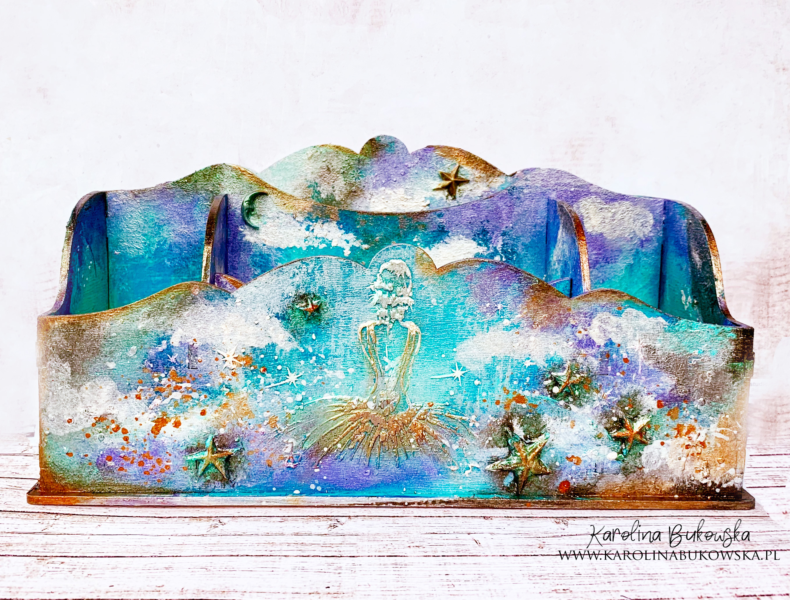 Cześć !!! W ten pochmurny dzień wpadła z małą dawką ekspresji i koloru, mam nadzieje, że oczaruje Was magia fioletu. Postawiłam na minimalizm. Prosto, lśniąco i dziewczęco. Taki był zamysł i oto efekty nocnych szaleństw. Do stworzenia organizera tak naprawdę potrzebowałam tylko bazę. Ten listownik pomieści wiele rzeczy, które są niezbędne na biurku skraperki. Ponadto jest wytrzymały! W końcu to sklejka !!!! W projekcie wykorzystałam moje ulubione media, które wcierałam w bazę. Uwielbiam to !!