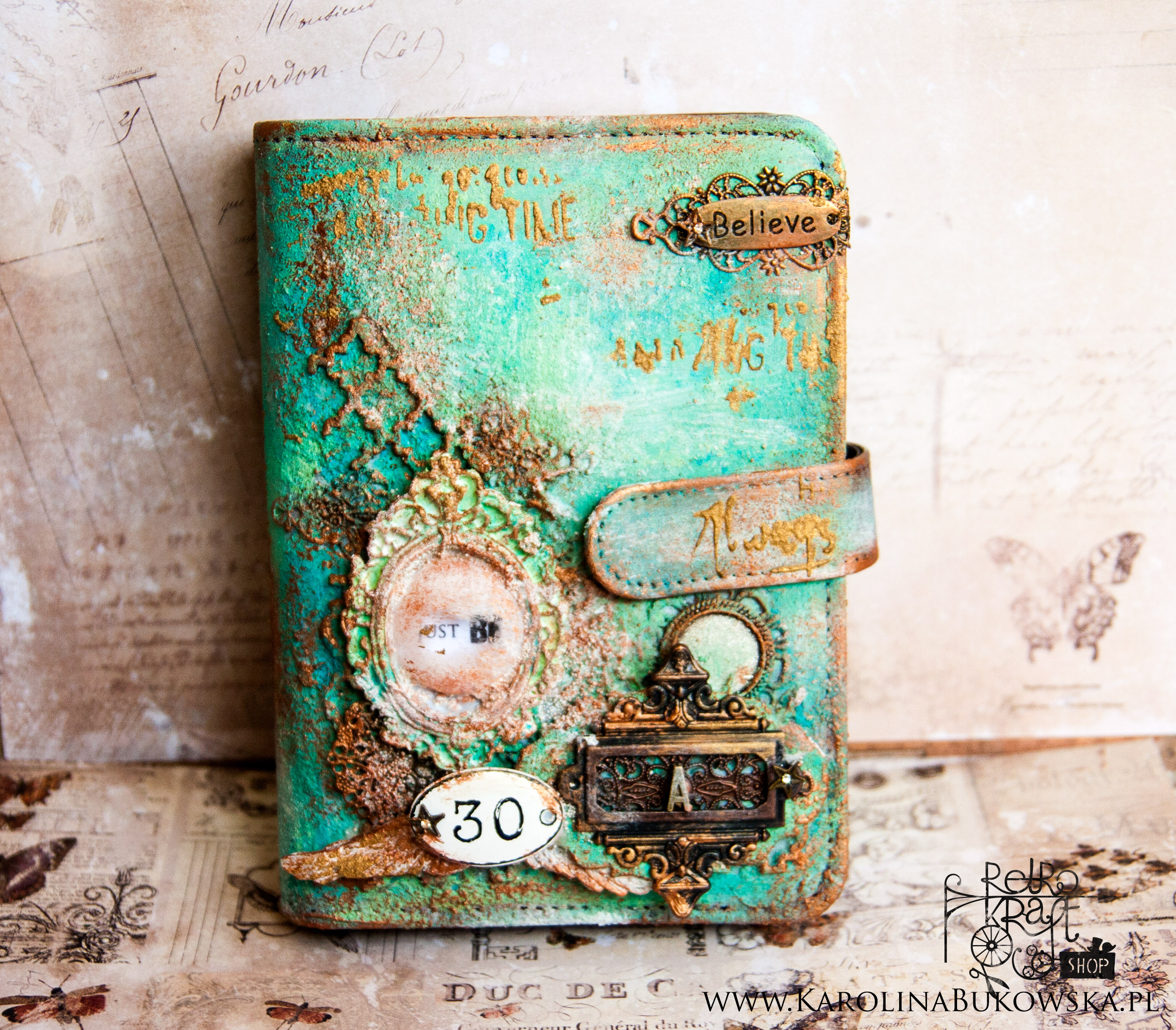 The planner was created using metal elements and Patina Paste Set – Finnabair. Creating with this product is extremely easy and fun! It was enough to mix together the blue and green and finally wipe with Brass