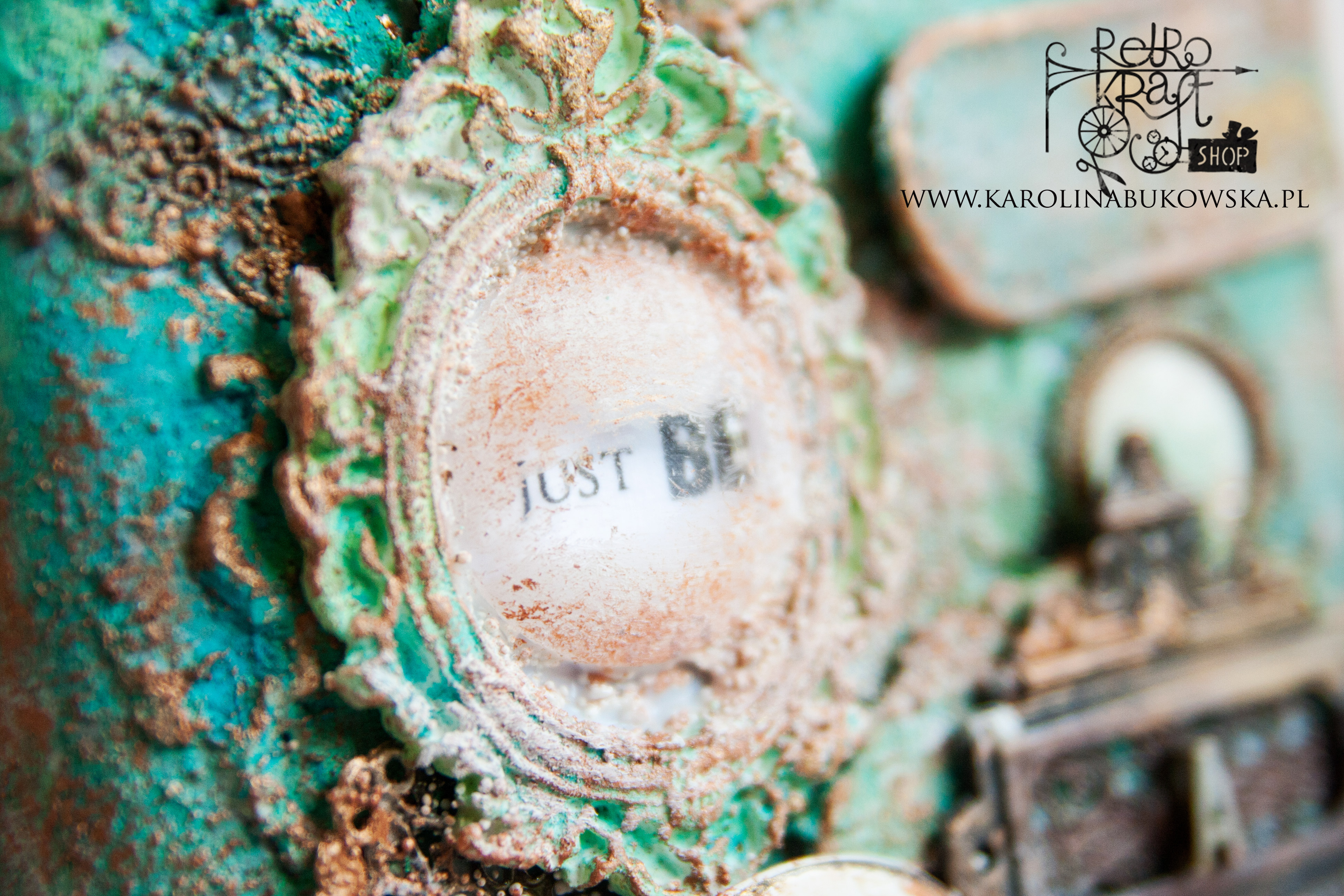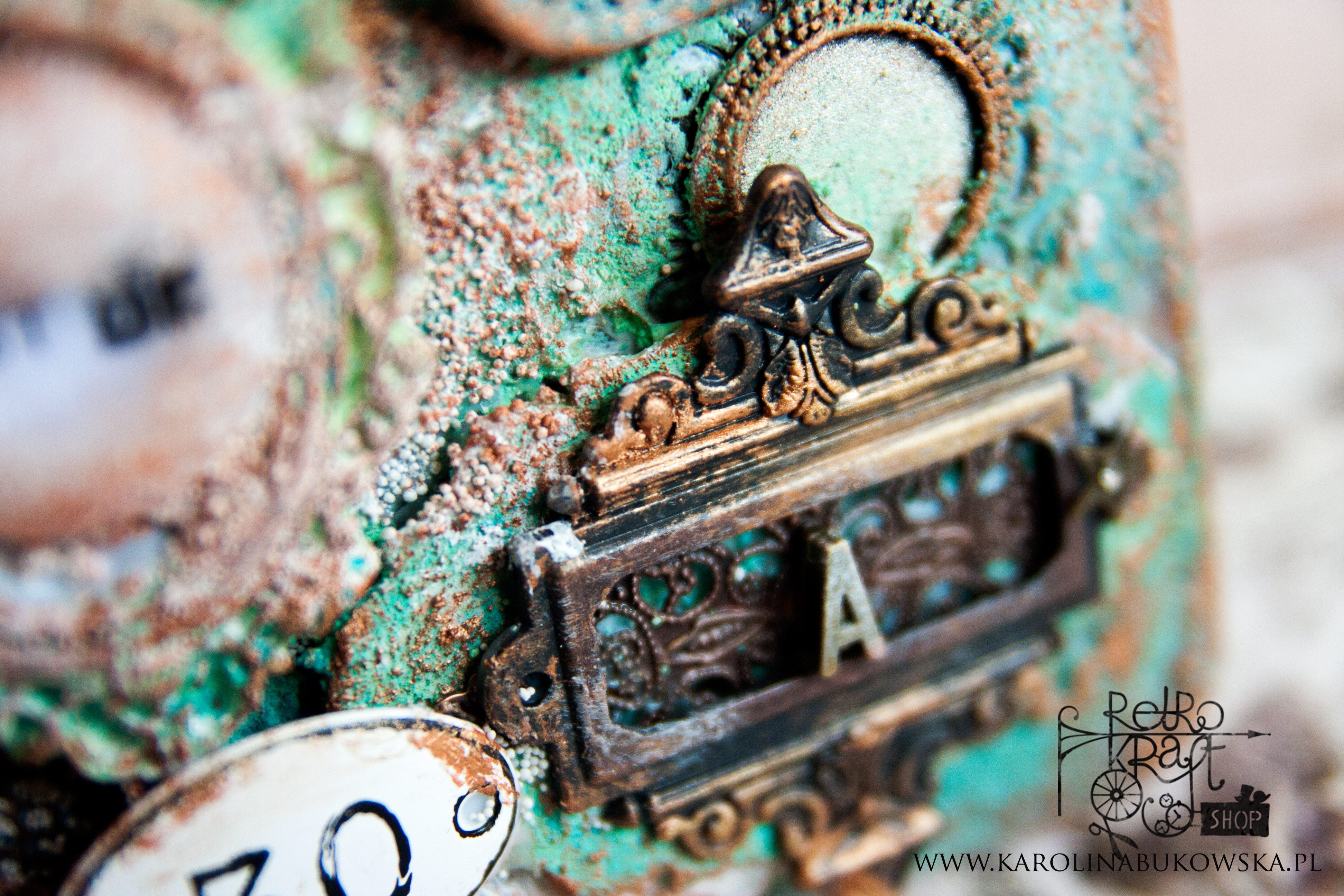 I must admit that I am delighted with Patina Effects Pastes. They are the perfect solution to quickly achieve amazing results. Today I put on white gesso, metal elements glued on with gel medium and covered the whole with Patina Effects Pastes. Yes, the effect is stunning. The pastes formed a beautiful texture, the project became multidimensional.