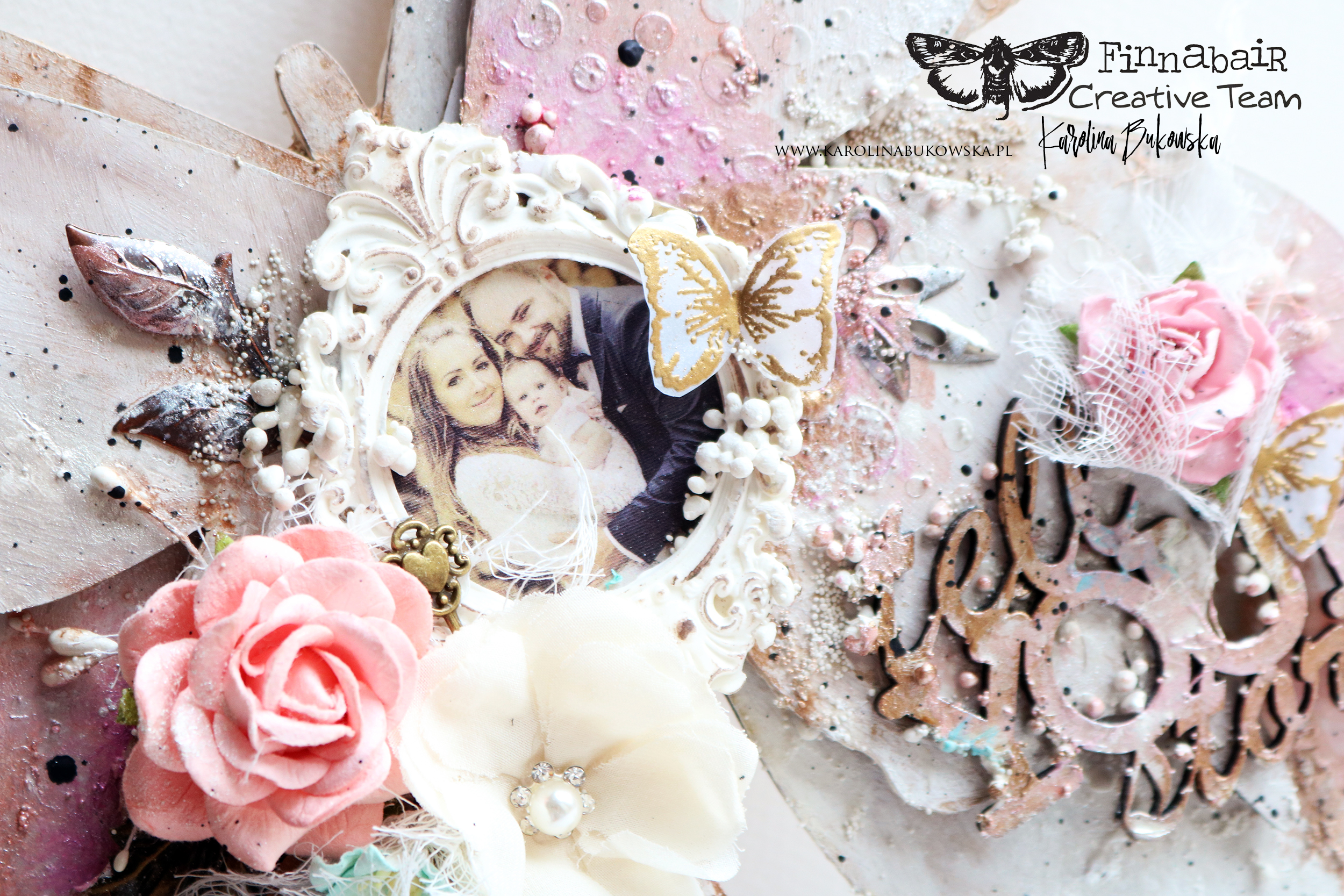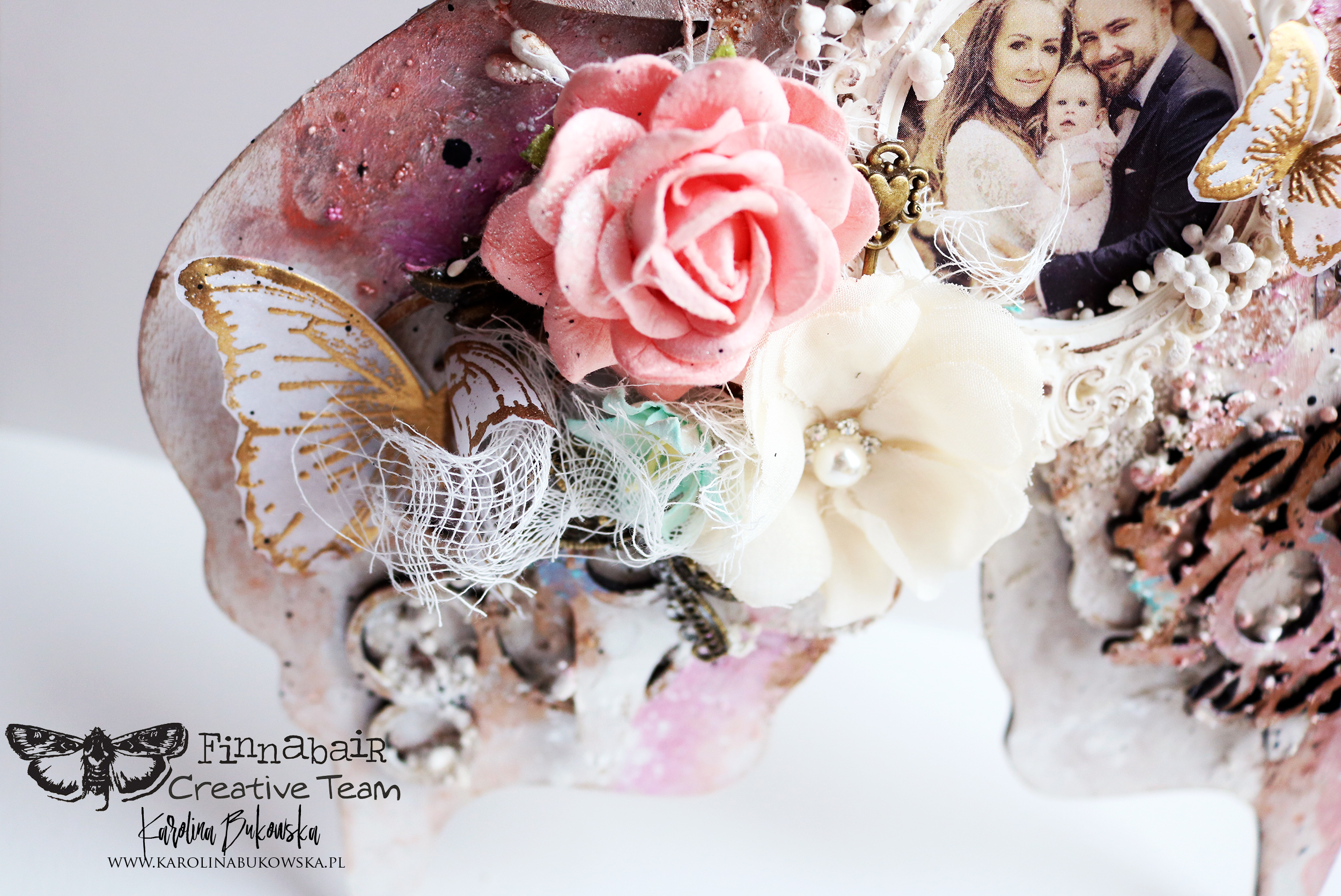 My mixed media version of a butterfly is a composition of colors, textures and embellishments that are making this delicate creature even more romantic with an added vintage touch. This time I decided to use a very subtle color palette.