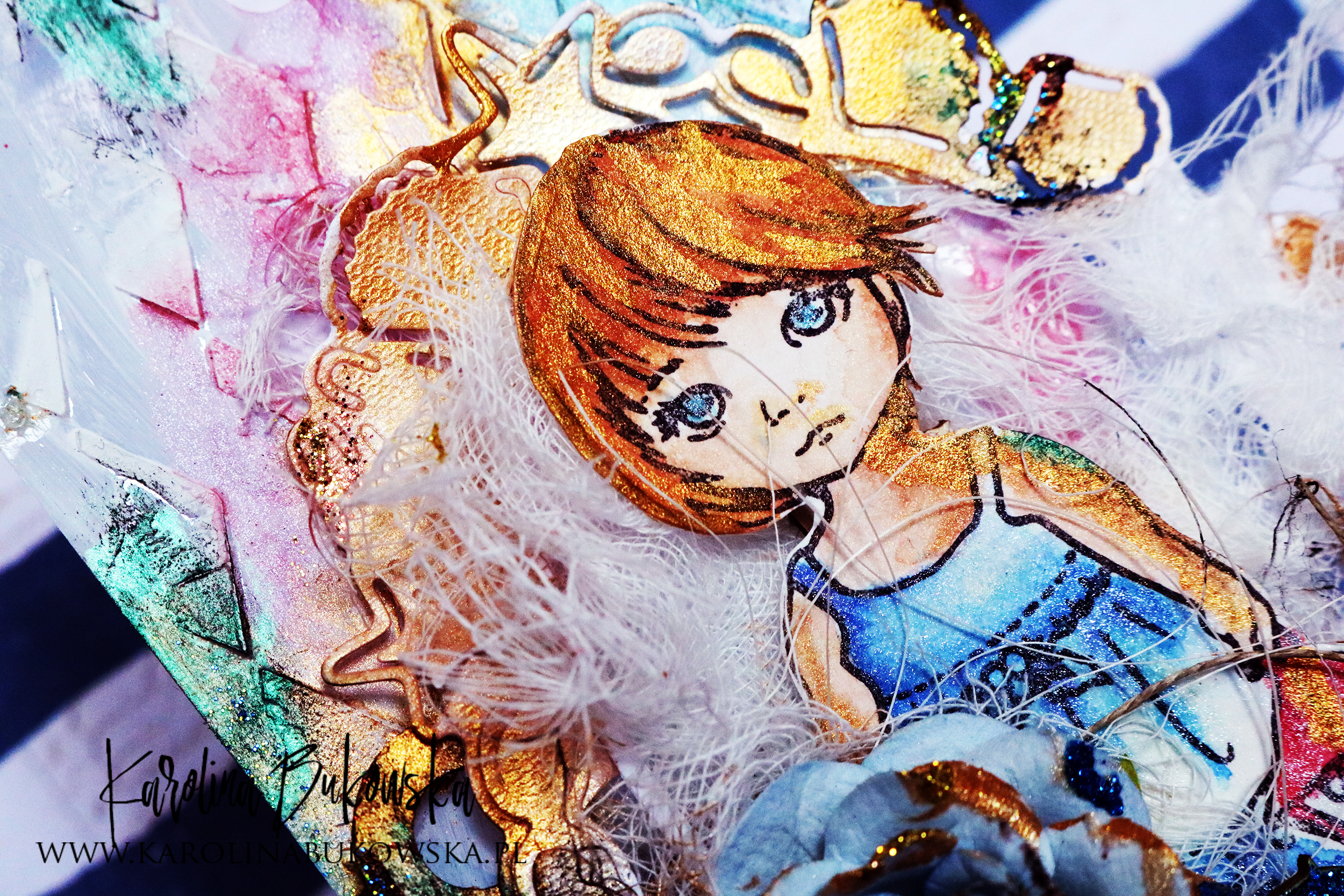 Today, Karolina here again and I am pleased to invite you to the mixed media tag. I created a transparent tag for you, wipe the gesso and paints. I love the stencil- rhombuses and the sweet stamp. Today, they are in the main role.