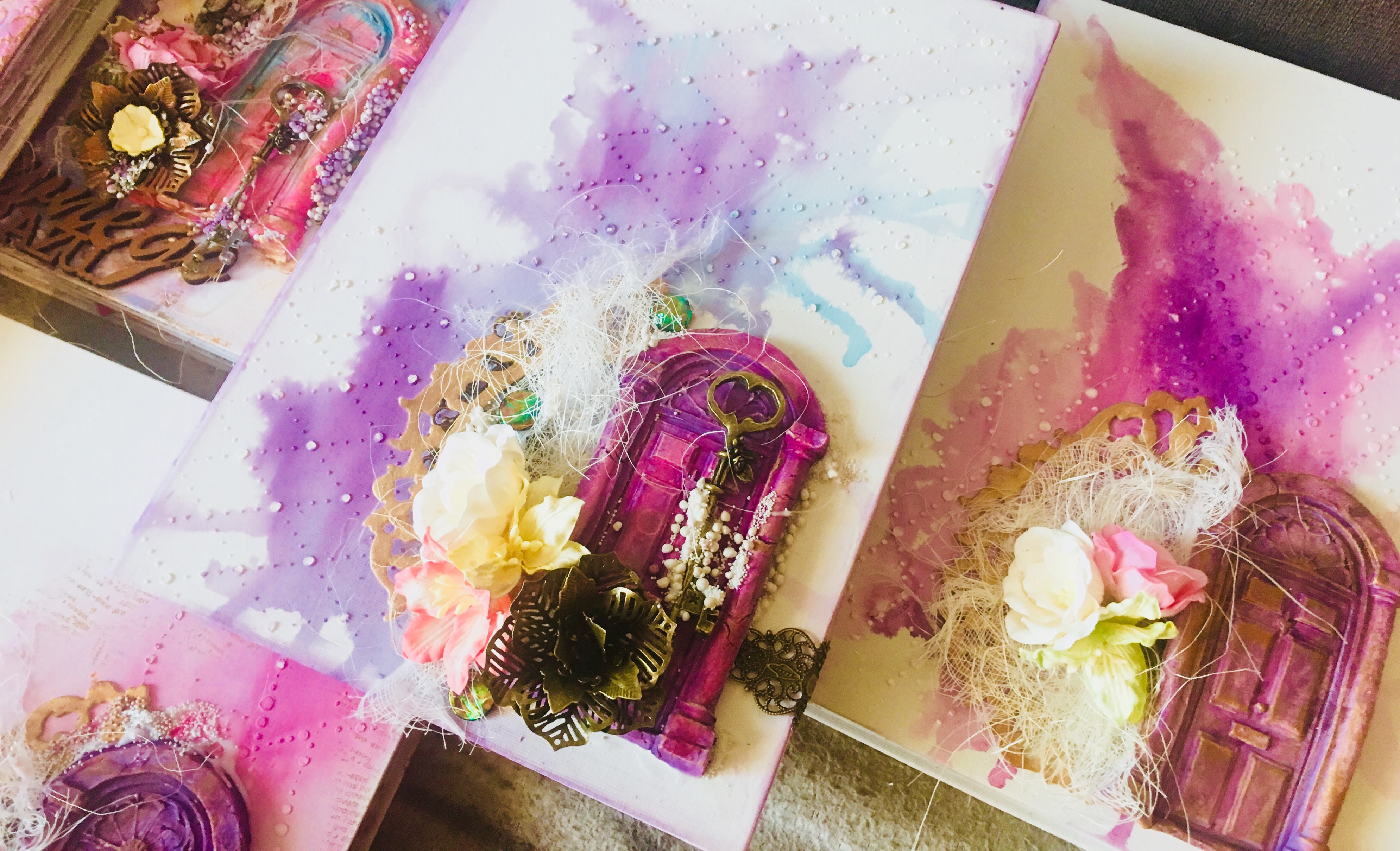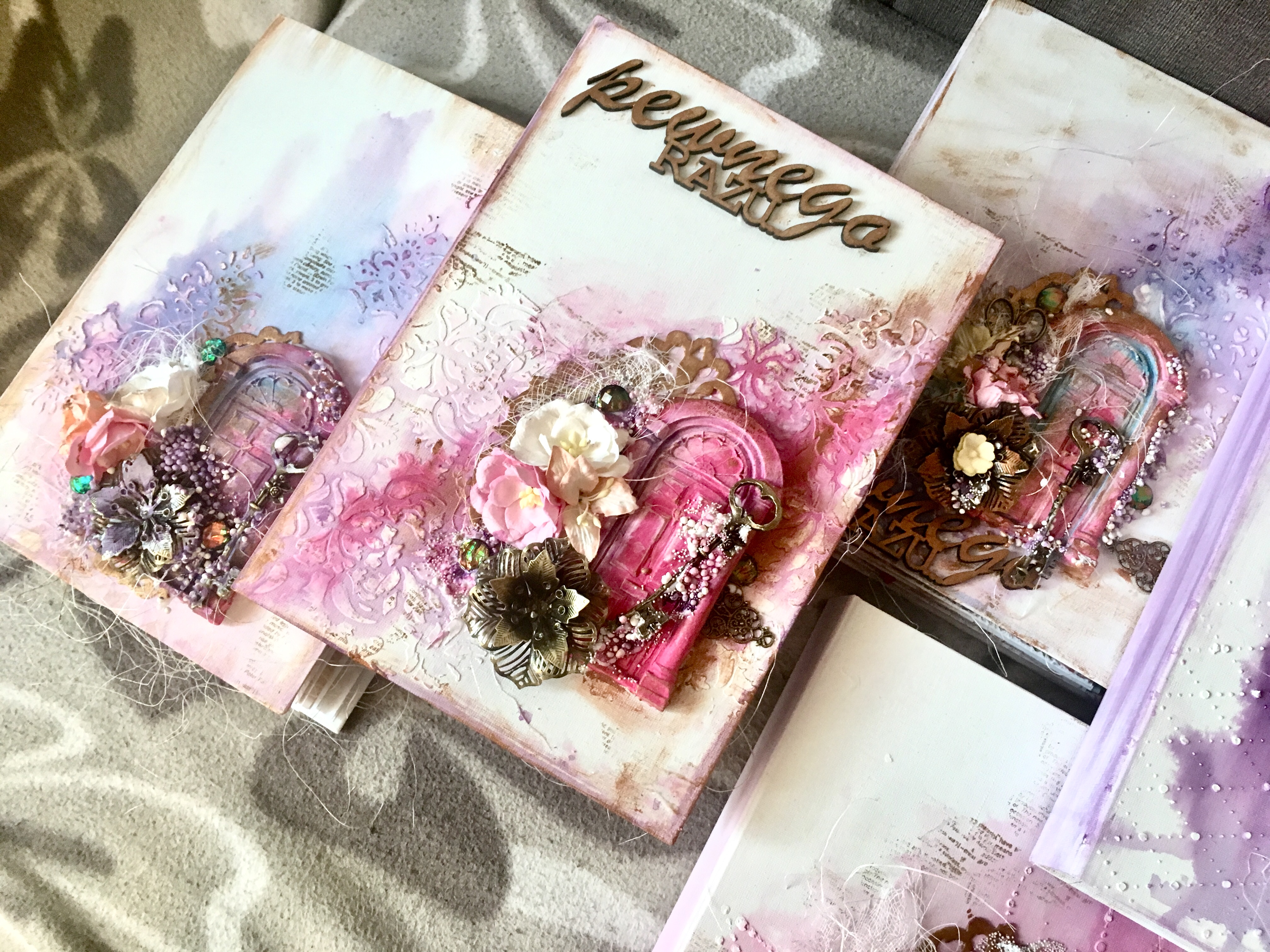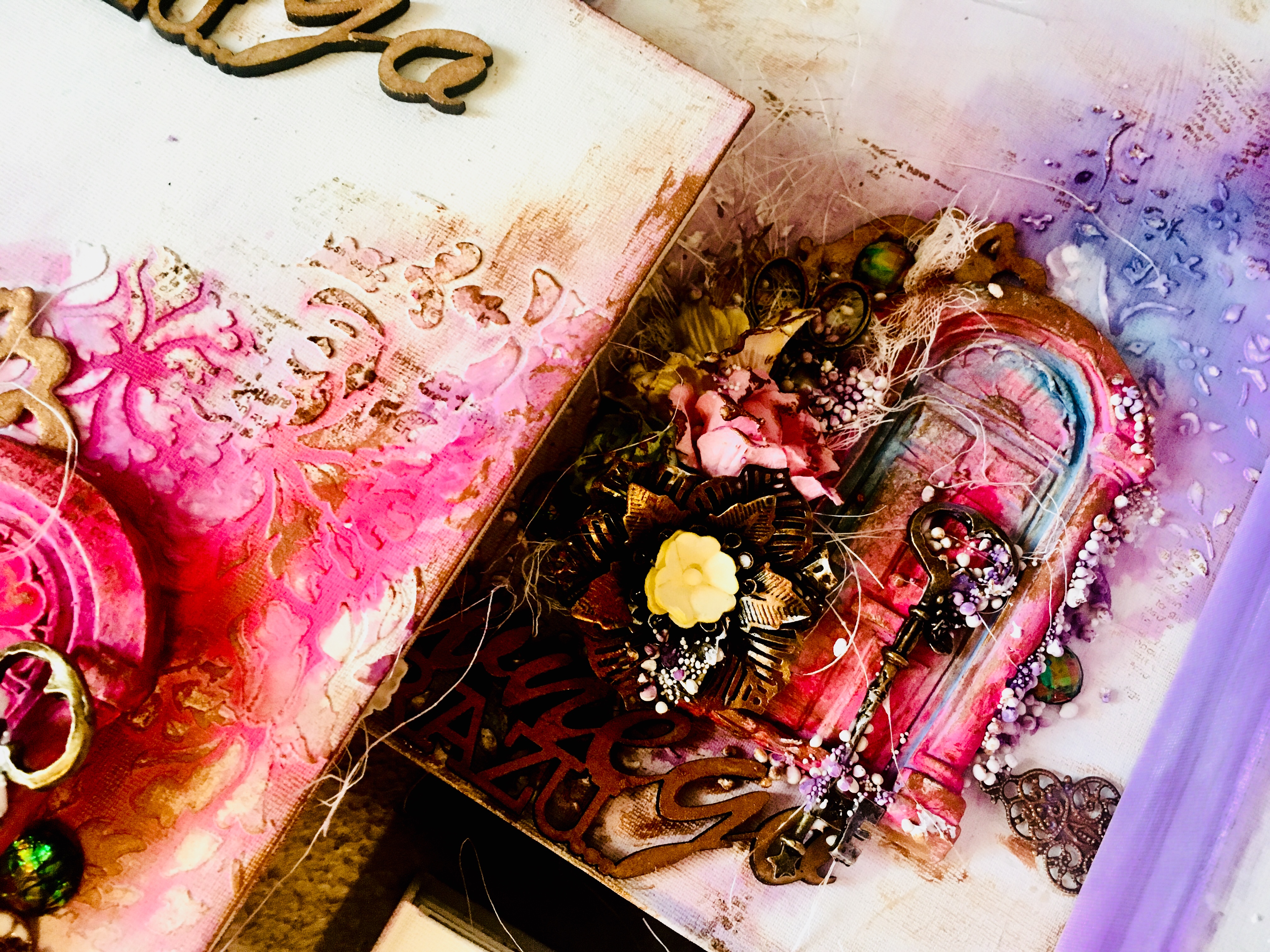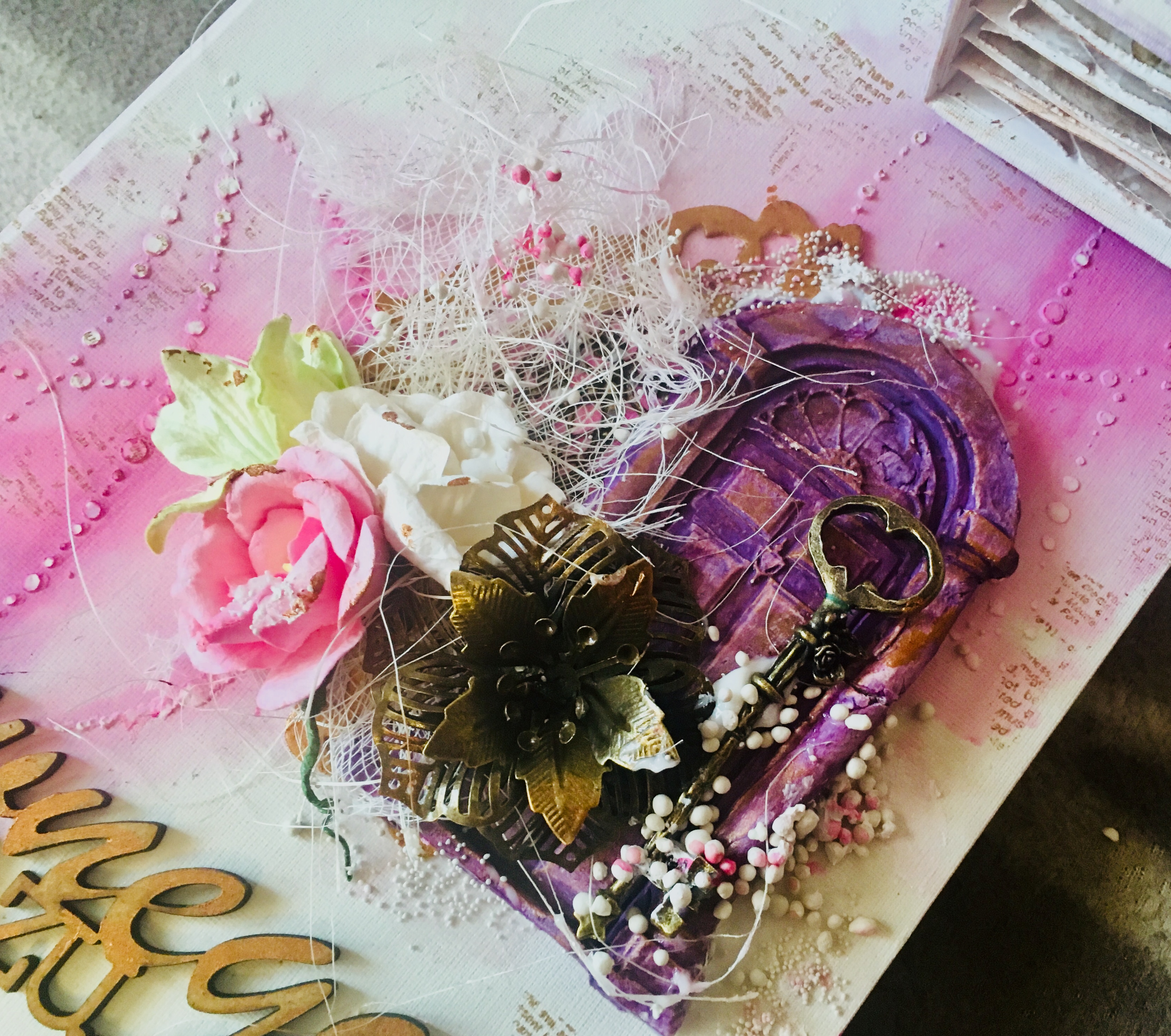 Cały projekt wzbogacony został o kwieciste tekturki oraz metalowe elementy i kwiaty. Nie zabrakło gazy i sizalu oraz techniki mixed media