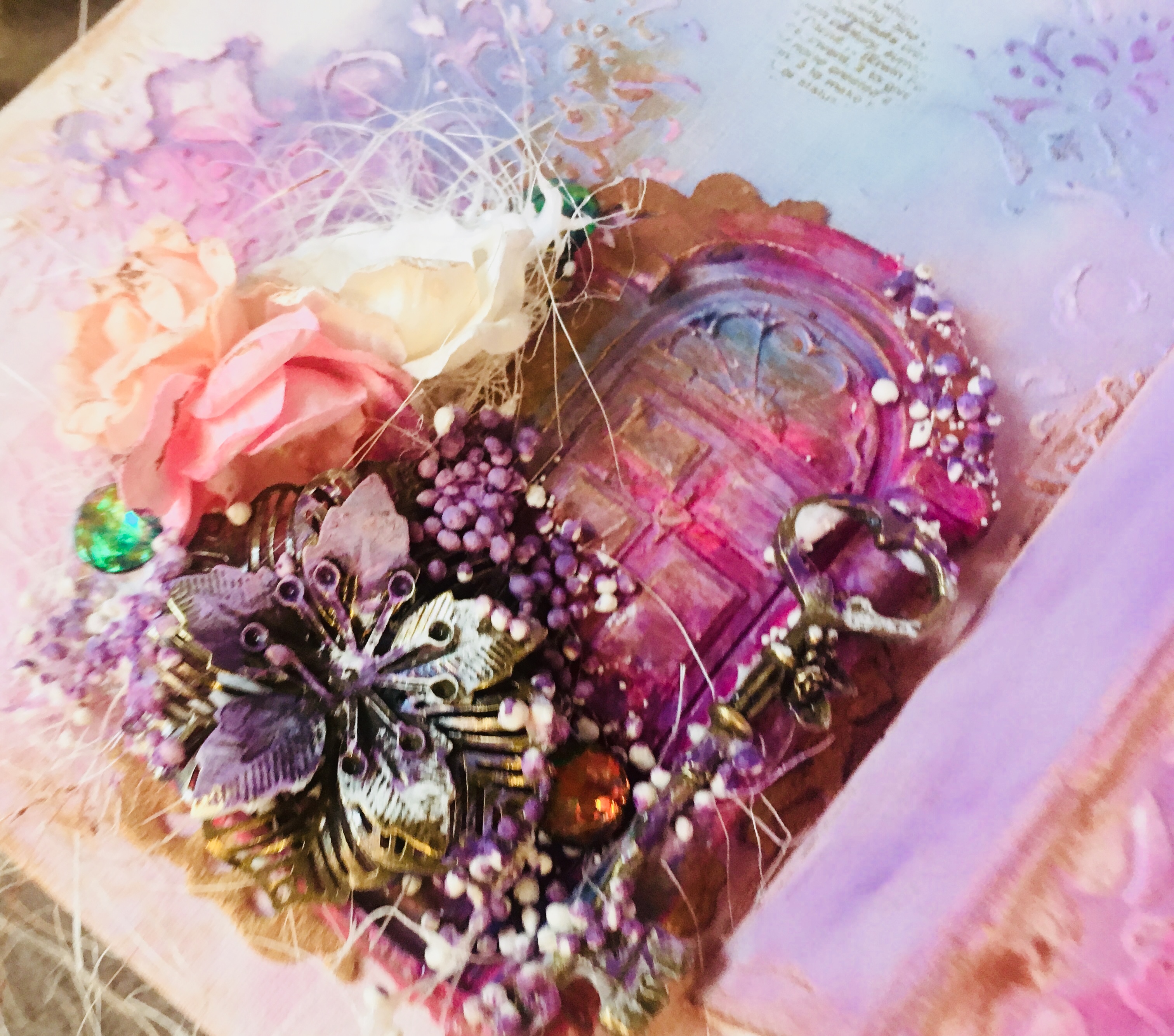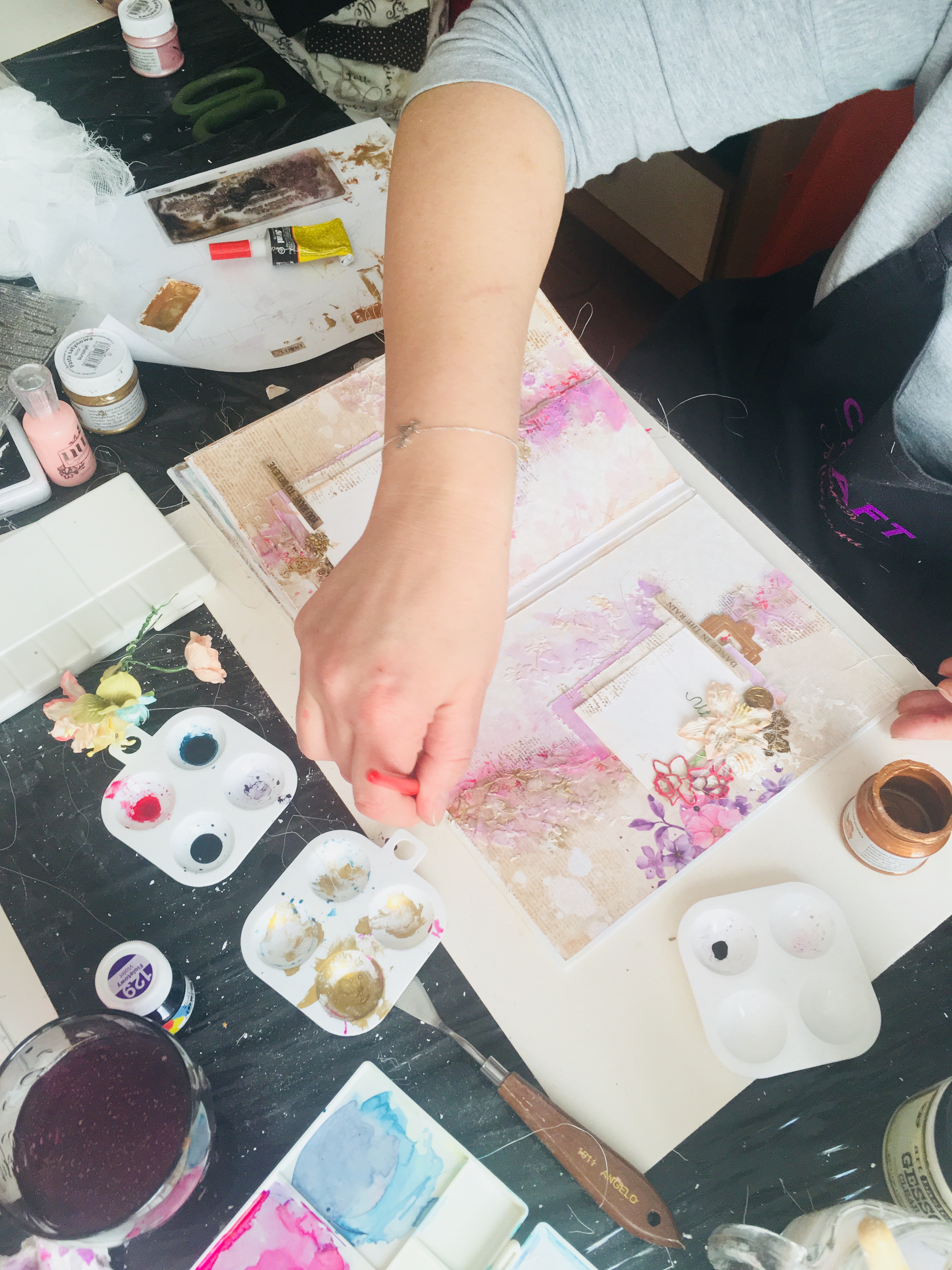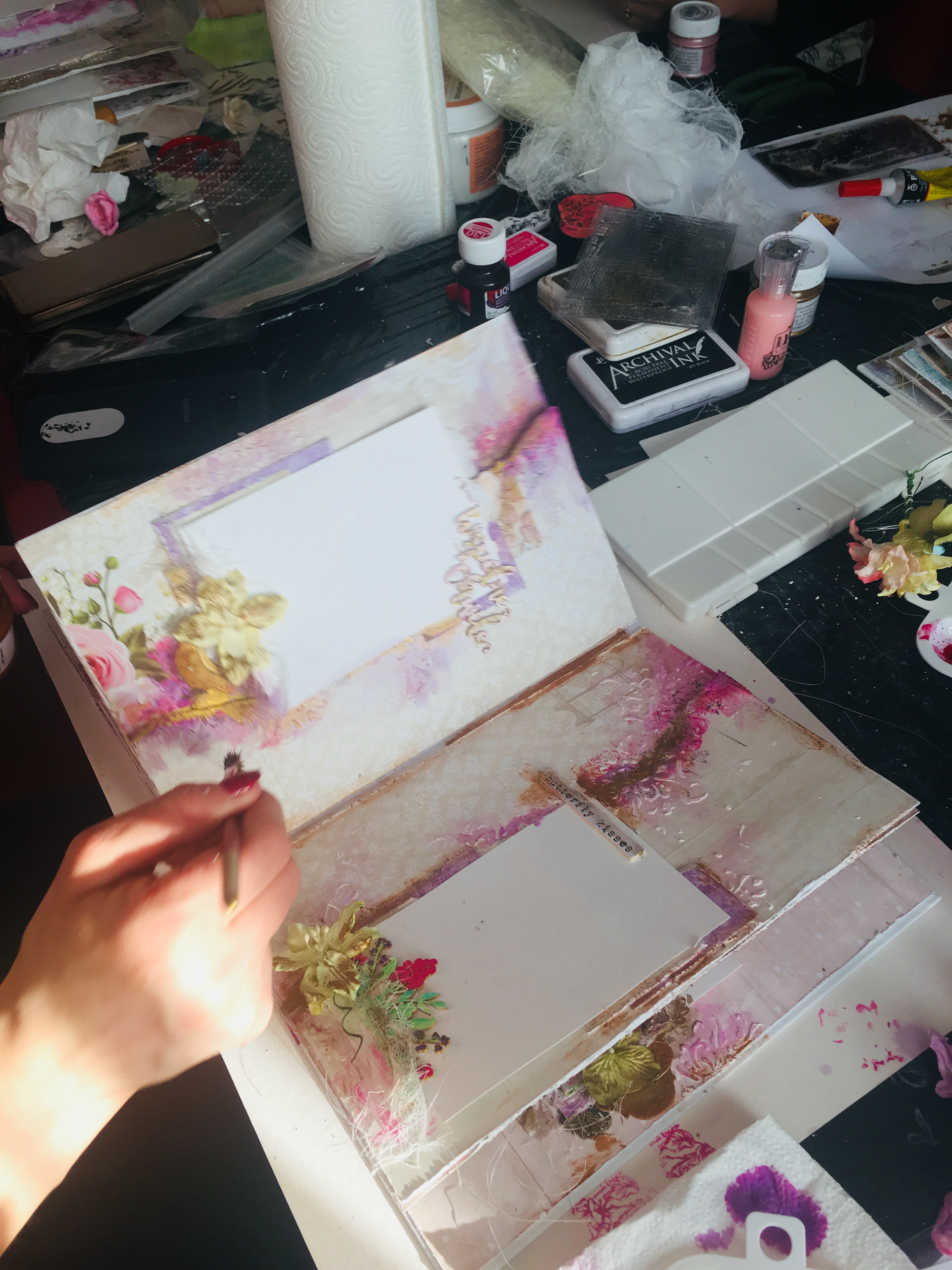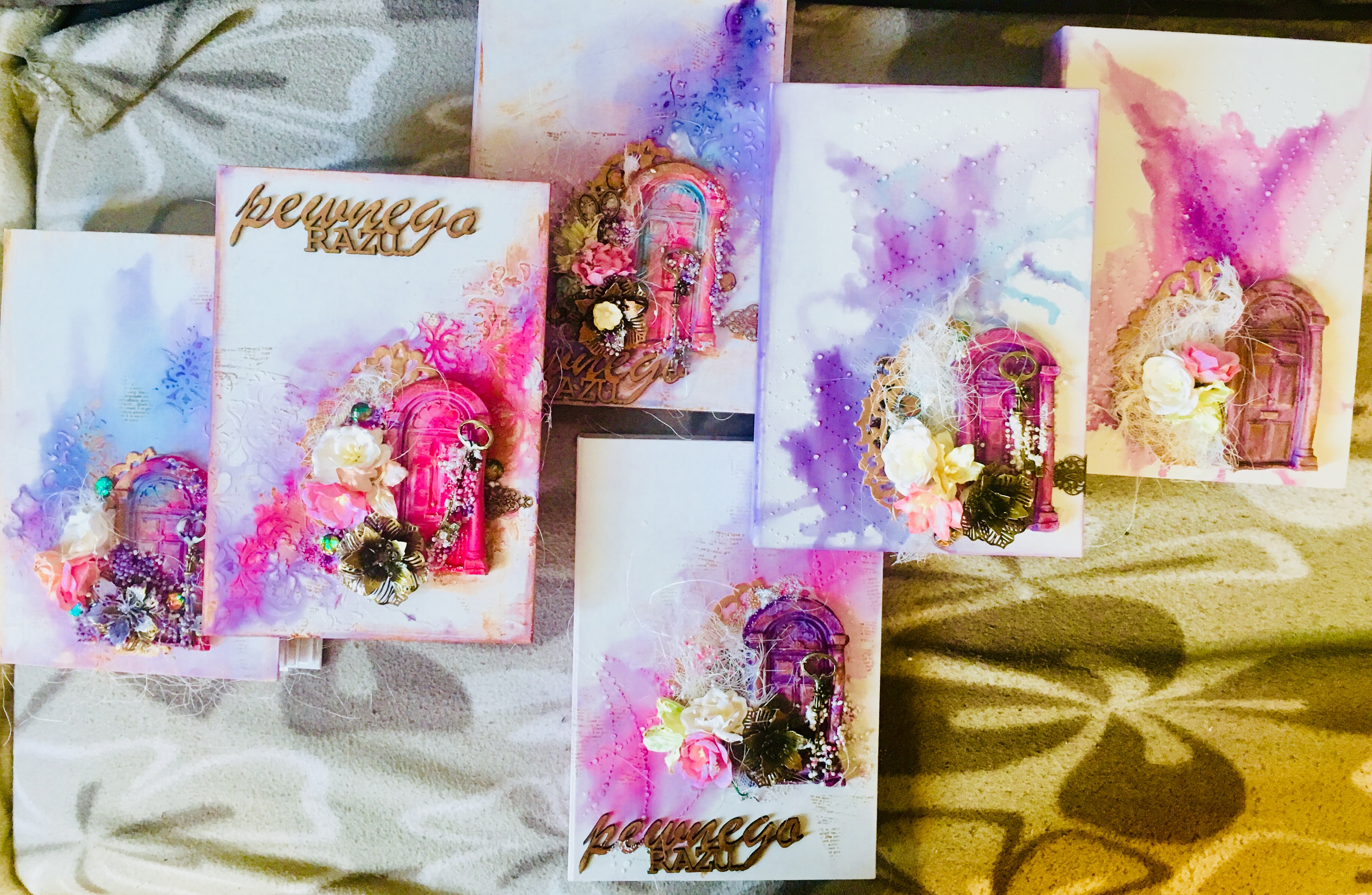 Cały projekt wzbogacony został o kwieciste tekturki oraz metalowe elementy i kwiaty. Nie zabrakło gazy i sizalu oraz techniki mixed media