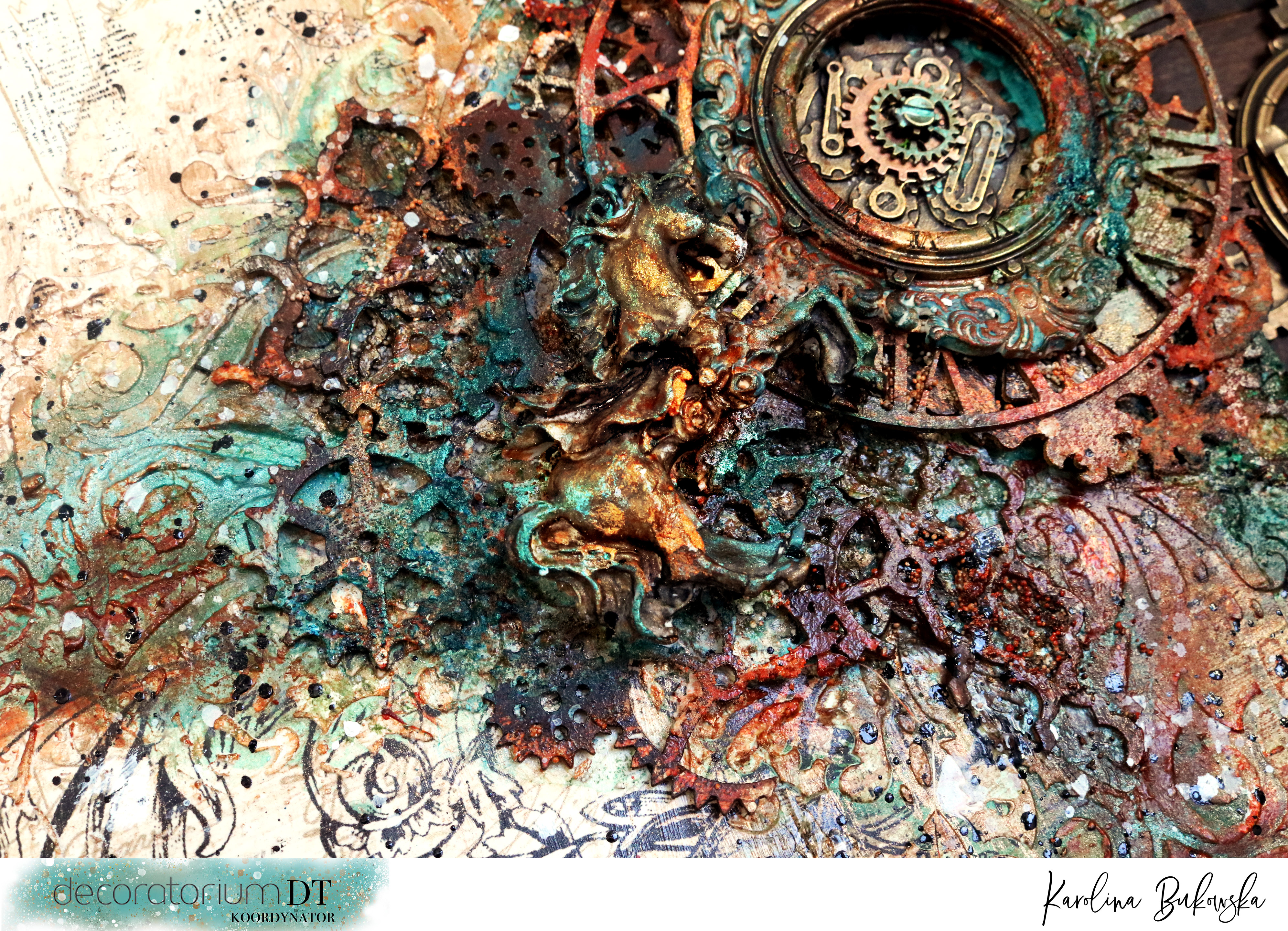 Pasta modelująca, pasta drobnoziarnista, śnieg i fluidy, żel medium, gesso białe i czarne to media po które najczęściej sięgam. I nie wyobrażam sobie mixed media bez nich. Do uzyskania efektu patyny i rdzy użyłam fluidów: Antiquing Cream – Patina Green i Quinacridone Gold
