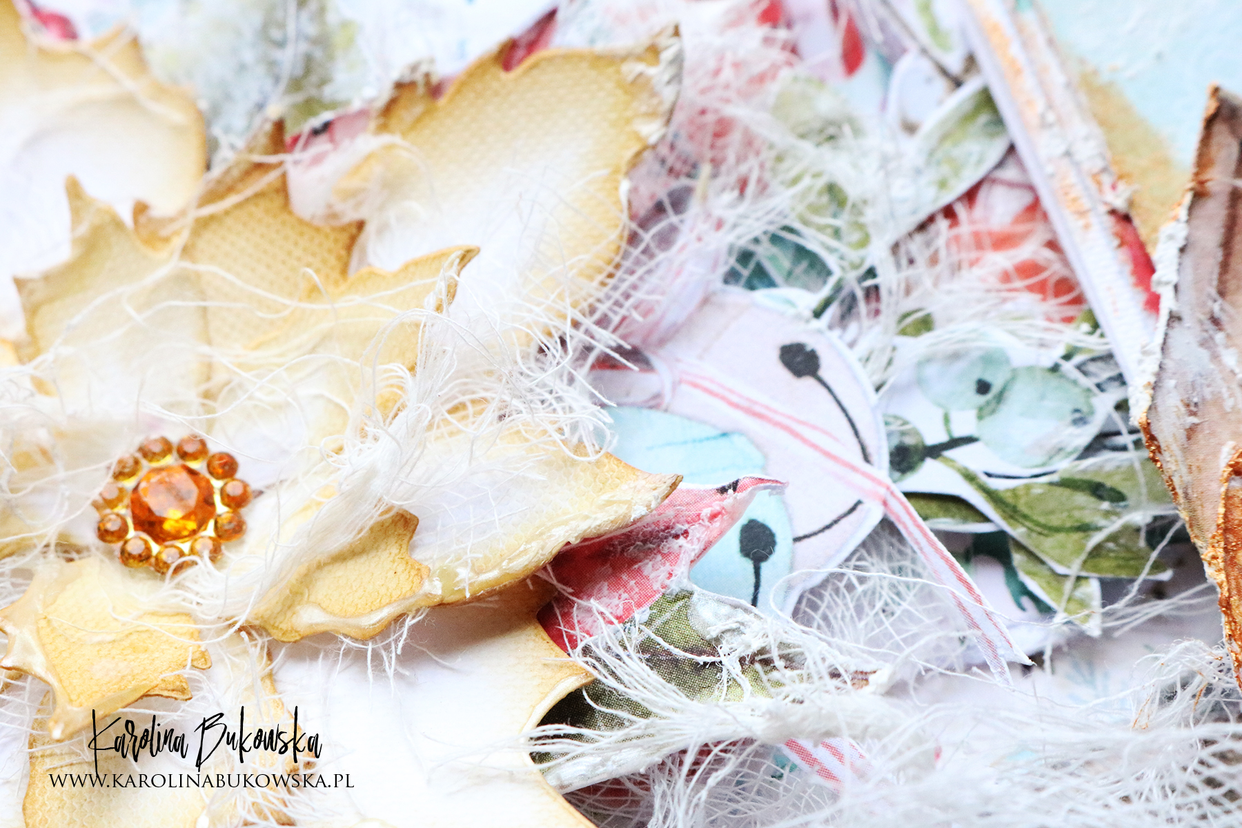 Kolekcja Karoli Witczak jest bardzo inspirująca. Przy jej pomocy jesteście w stanie wyczarować wiele projektów świątecznych. Wystarczy wyciąć kilka elementów ozdobnych z arkusza papierów, aby stworzyć przestrzenną kompozycję. Aby projekt był puszysty i zimowy, dodałam gazy i śniegu. Całość delikatnie przetarłam tuszem Distress.